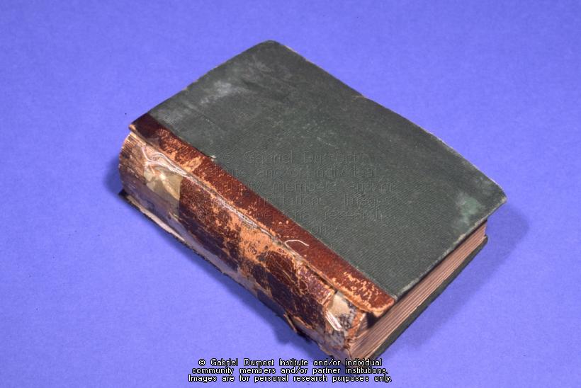 | Description: | This is a photograph of a French-English dictionary, which contains the following caption on the onside page: “Louis Riel, Batoche, 1883”. It seems unlikely that this dictionary belonged to Louis Riel since he was not in Batoche in 1883. At the time, he was a schoolteacher in the Montana Territory. This artifact is part of the A.C. D. Pigott Collection, which was donated to the Gabriel Dumont Institute in October 1991 by the Pappas family of Vancouver, British Columbia. The collection includes: Louis Riel’s English-French dictionary, Lieutenant Colonel Pigott’s 1885 Resistance battlefield manuscript, and a number of artifacts taken off the battlefield including: an inscribed watch, a pipe, a bullet maker and a buffalo powder horn (both from the Métis trenches), a carved wooden container taken from Big Bear’s camp, a First Nations decorative bracelet and horsehair braiding, which may have been traded for food by the Boulton’s Scouts. |