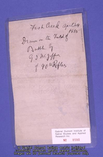 This is the reverse side of a map of the Battle of Fish Creek, dated April 24, 1885. It was drawn “on the field of battle” by G.I. McGiffen of the 90th Rifles. The writing on the back is that of Lieutenant-Colonel A.C.D. Pigott. This document, part of A.C.D. Pigott’s post 1885 personal correspondence, is part of the A.C.D. Pigott Collection, which was acquired by the Gabriel Dumont Institute in October 1991 from the Ted Pappas family of Vancouver, British Columbia. The collection includes: Louis Riel’s English-French dictionary, Lieutenan- Colonel Pigott’s 1885 Resistance battlefield manuscript, and a number of artifacts taken off the battlefield including: an inscribed watch, a pipe, a bullet maker and a buffalo powder horn (both from the Métis trenches), a carved wooden container taken from Big Bear’s camp, a First Nations decorative bracelet and horsehair braiding, which may have been traded for food by somebody captured by the Boulton’s Scouts. |