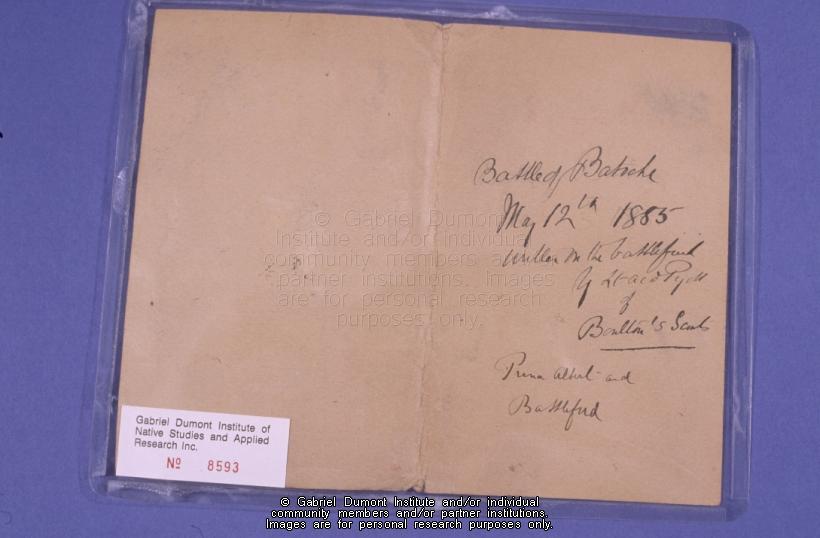 This document, written during the 1885 Resistance, is part of a battlefield manuscript written by Lieutenant Colonel A.C.D. Pigott of Boulton’s Scouts. Pigott’s manuscript documents Poundmaker’s, Louis Riel’s and General Middleton’s correspondence during the 1885 Resistance. This item is part of the A.C.D. Pigott Collection, which was acquired by the Gabriel Dumont Institute in October 1991 by the Ted Pappas family of Vancouver, British Columbia. The collection includes: Louis Riel’s English-French dictionary, Lieutenant Colonel Pigott’s 1885 Resistance battlefield manuscript, and a number of artifacts taken off the battlefield including: an inscribed watch, a pipe, a bullet maker and a buffalo powder horn (both from the Métis trenches), a carved wooden container taken from Big Bear’s camp, a First Nations decorative bracelet and horsehair braiding, which may have been traded for food by somebody captured by the Boulton’s Scouts. |