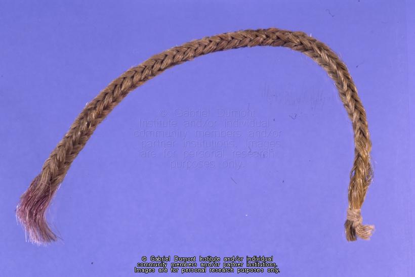 Description: This is a photograph of braided horsehair, which was made by a First Nations captive of Boulton’s Scouts during the 1885 Resistance. This artifact is part of the A.C. D. Pigott Collection, which was donated to the Gabriel Dumont Institute in October 1991 by the Pappas family of Vancouver, British Columbia. The collection includes: Louis Riel’s English-French dictionary, Lieutenant Colonel Pigott’s 1885 Resistance battlefield manuscript, and a number of artifacts taken off the battlefield including: an inscribed watch, a pipe, a bullet maker and a buffalo powder horn (both from the Métis trenches), a carved wooden container taken from Big Bear’s camp, a First Nations decorative bracelet and horsehair braiding, which may have been traded for food by somebody captured by the Boulton’s Scouts.