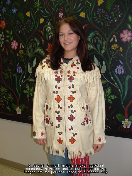 Description: Photograph of beaded coat on white hide. This item is part of the Gabriel Dumont Institute Museum Collection.