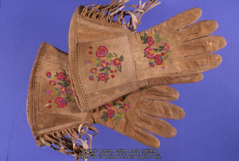 | Description: | Photograph of deer hide gauntlets with silk embroidery. This item is part of the Gabriel Dumont Institute Museum Collection.