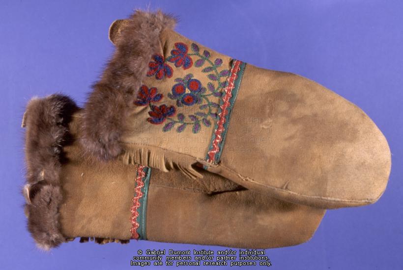 | Description: | Photograph of hide mittens with silk embroidery. This item is part of the Gabriel Dumont Institute Museum Collection.