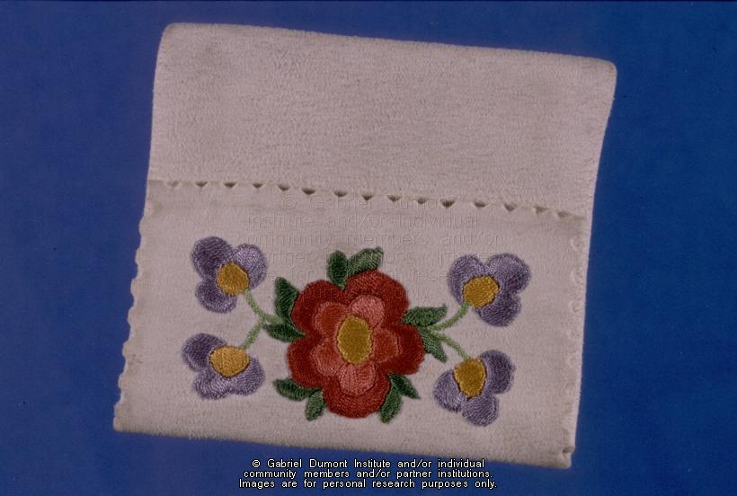 | Description: | Photograph of embroidered hide watch pocket. This item is part of the Gabriel Dumont Institute Museum Collection. |