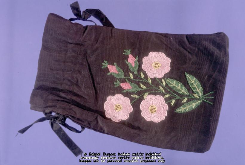 | Description: | Photograph of an embroidered black cotton bag - side B. This cotton bag was made for Kate Gretchen Clink in the late nineteenth or early twentieth centuries. This item is part of the Gabriel Dumont Institute Museum Collection. |