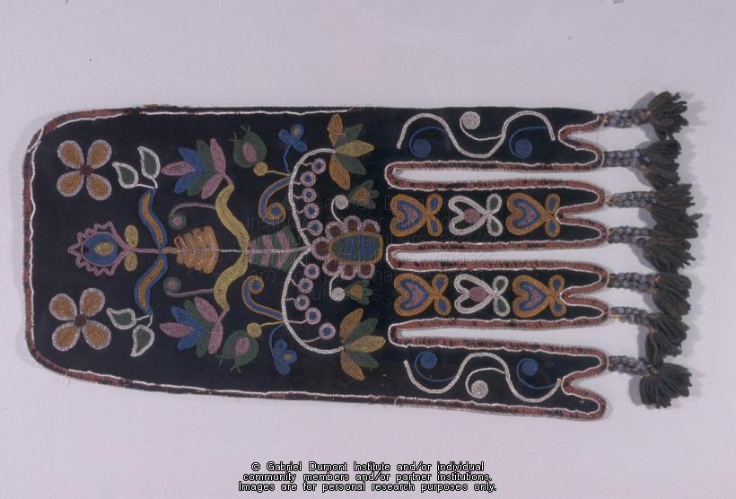 | Description: | Photograph of a beaded panel from an octopus bag - collected by Marius Barbeau. Wool stroud, glass and trade beads, silk ribbon, wool tassle. This item is part of the Gabriel Dumont Institute Museum Collection.