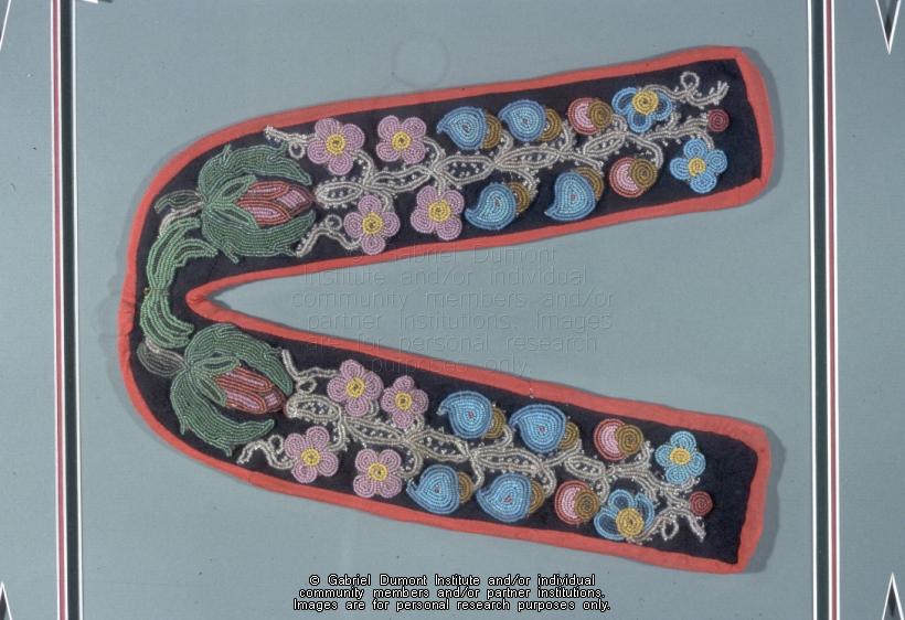 | Description: | Photograph of a framed beaded yoke. This item is part of the Gabriel Dumont Institute Museum Collection. |