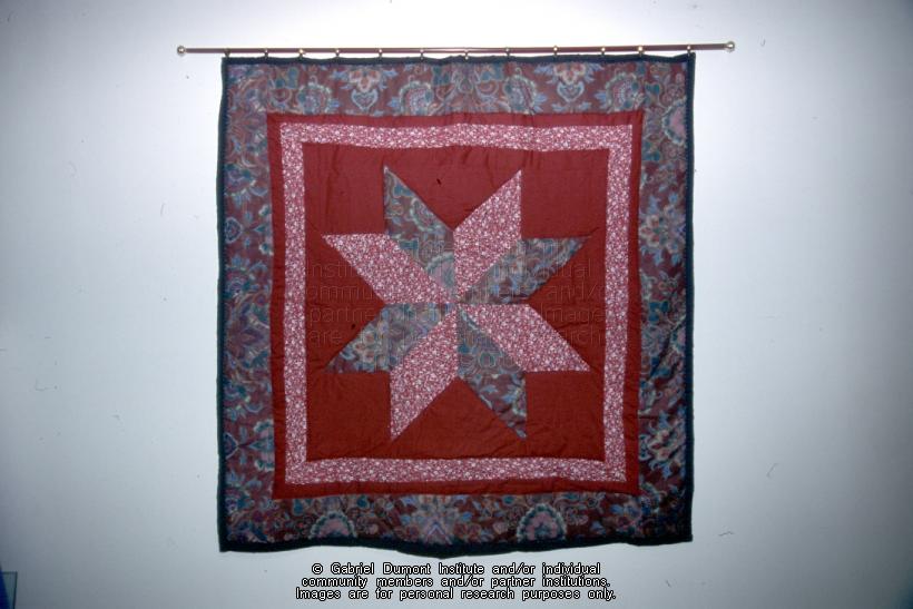 Description: Photograph of a star patterned quilt wall hanging, made by Marie "Billie" Robison, nee Welsh. This item is part of the Gabriel Dumont Institute Museum Collection.