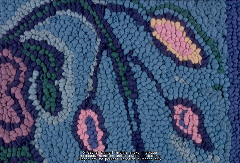 Description: Close up photograph of a rag hooked rug. This item is part of the Gabriel Dumont Institute Museum Collection.