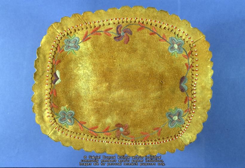 | Description: | Photograph of an embroidered lamp pad. This item is part of the Gabriel Dumont Institute Museum Collection. |