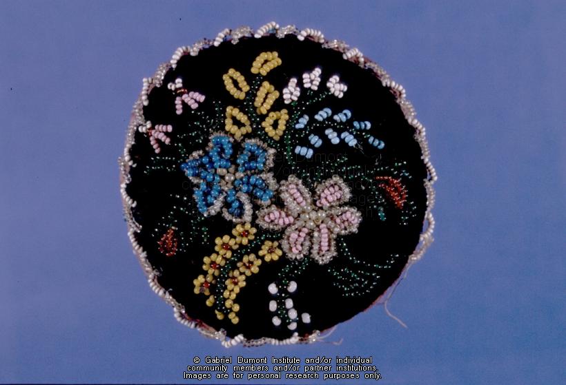 Description: Photograph of a beaded pin cushion. This item is part of the Gabriel Dumont Institute Museum Collection.