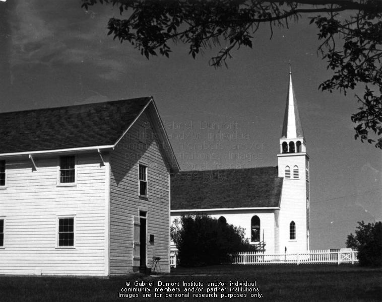 An image of the church of St. Antoine de Padoue and its rectory at Batoche, circa the 1950s. Deryk Bodington (1914-), a professional photographer and a freelance writer working out of Calgary, Alberta, donated these images to the Gabriel Dumont Institute. The images were taken in the 1950s-70s and centre on Batoche and its environs. Bodington also donated photographs to the Glenbow Museum and Archives in Calgary and to the National Archives of Canada in Ottawa Ontario. He specialized in Western-Canadian landscapes and rural heritage. |