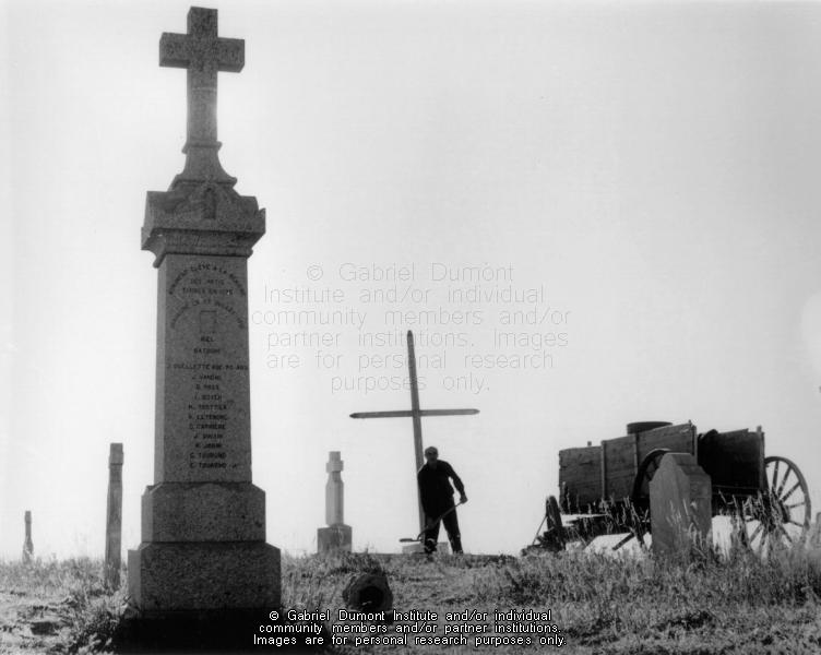 This image is of the memorial erected to commemorate the fallen Métis at Batoche in 1885. It was erected on July 23, 1901. The names listed on the memorial are J Ouelette (age 90), J. Vandal, D. Ross, I. Boyer, M. Trottier, A. Letendre, D. Carriere, J. Swain, A. Jobin, C. Tourond and E. Tourond. Deryk Bodington (1914-), a professional photographer and a freelance writer working out of Calgary, Alberta, donated these images to the Gabriel Dumont Institute. The images were taken in the 1950s-70s and centre on Batoche and its environs. Bodington also donated photographs to the Glenbow Museum and Archives in Calgary and to the National Archives of Canada in Ottawa Ontario. He specialized in Western-Canadian landscapes and rural heritage. |