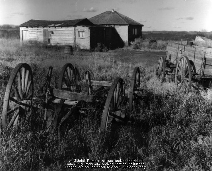 An image of wagons in an abandoned farmyard around Batoche, SK, circa the 1950s. Deryk Bodington (1914-), a professional photographer and a freelance writer working out of Calgary, Alberta, donated these images to the Gabriel Dumont Institute. The images were taken in the 1950s-70s and centre on Batoche and its environs. Bodington also donated photographs to the Glenbow Museum and Archives in Calgary and to the National Archives of Canada in Ottawa Ontario. He specialized in Western-Canadian landscapes and rural heritage. |