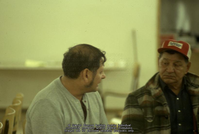 | Description: | Image of Rod Bishop (Left) talking to an Elder at an Association of Métis and Non-Status Indians of Saskatchewan (AMNSIS) meeting in the early 1980s. AMNSIS was the forerunner of the Métis Nation – Saskatchewan. |