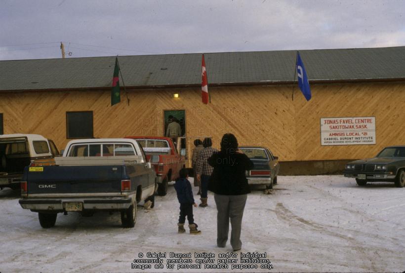 | Description: | Outside entrance of the Jonas Favel Centre in Sakitowak, SK. The centre served as a local for the Association of Métis and Non-Status Indians of Saskatchewan (AMNSIS). AMNSIS was the forerunner of the Métis Nation – Saskatchewan.