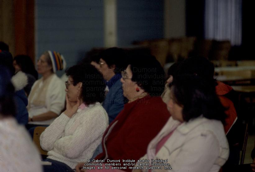 | Description: | Métis women attending a meeting at the Gabriel Dumont Institute. This may have been taken during one of the Institute’s annual cultural conferences. |