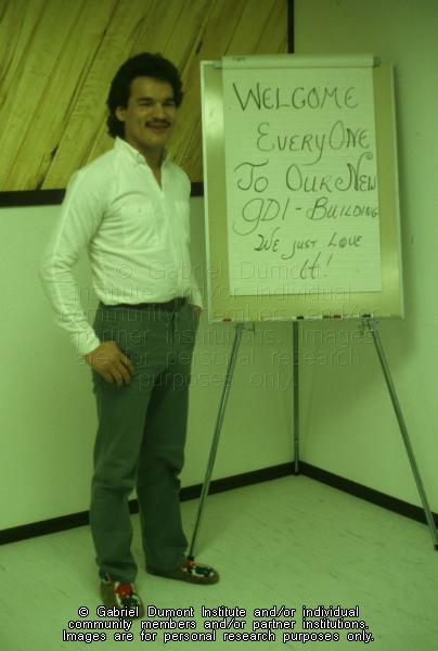 | Description: | Image of Ordean Goulet welcomes people to the Gabriel Dumont Institute’s new office in Saskatoon circa 1985. |
