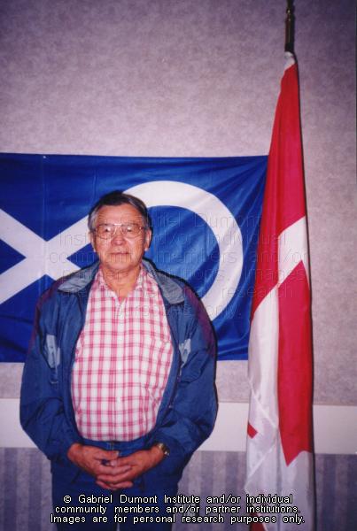 | Description: | Image of an Elder in front of a Métis flag. |