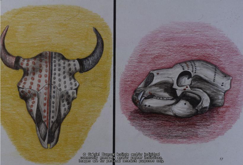 Illustration, from "A Comparison of Two Cultures", of a bison and a bear skull. Great lakes and Plains First Nations possibly used these items for medicine. |