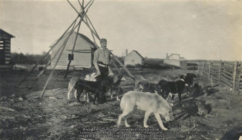 | Description: | Constable Thompson of the Royal North-West Mounted Police, with his dogs, in a Chipewyan village at the mouth of the "Buffalo River" (Dillon SK), September 1908. From the Frank J.P. Crean fonds.