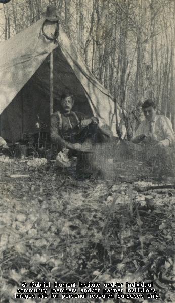 | Description: | Frank J.P. Crean and possibly his assistant W.R. Caldwell, on the New Northwest Exploration Expedition, sitting outside their tent in northwestern Saskatchewan, 1908.