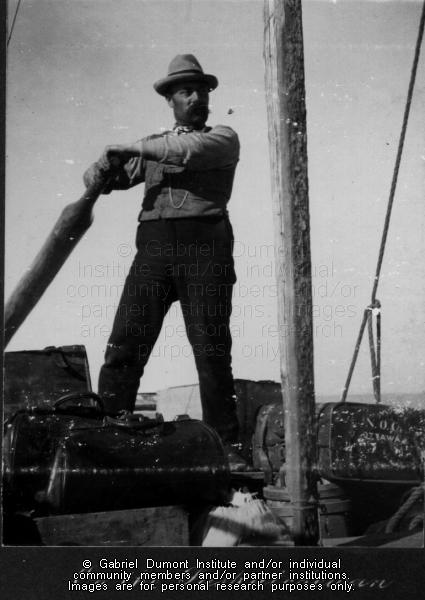 | Description: | Steersman of the York boat carrying the Half-Breed Commissioners throughout Saskatchewan, 1900. From the Narcisse-Omer Cote fonds. |