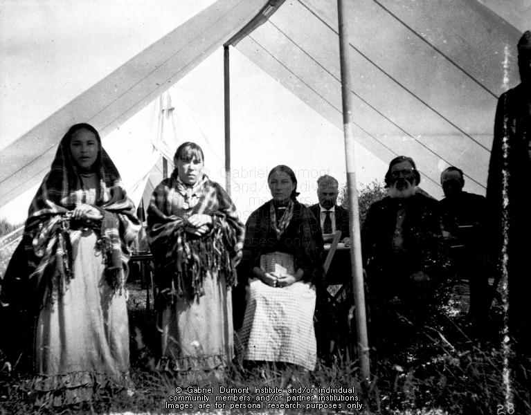 | Description: | A group of Indians and/or Métis outside the Half-Breed Commissioners' tent, Devil's Lake (near Sandy Lake Reserve) NWT, 1900. From the Narcisse-Omer Cote fonds.