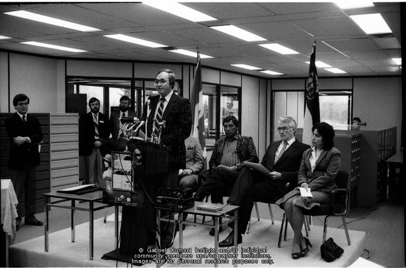 Rick Folk, Minister of Culture and Recreation, speaking at the presentation of Louis Riel's diary to the Saskatchewan Archives Board by the Saskatchewan government in Regina, Feb. 23, 1984. From the D.H. Bocking Collection.