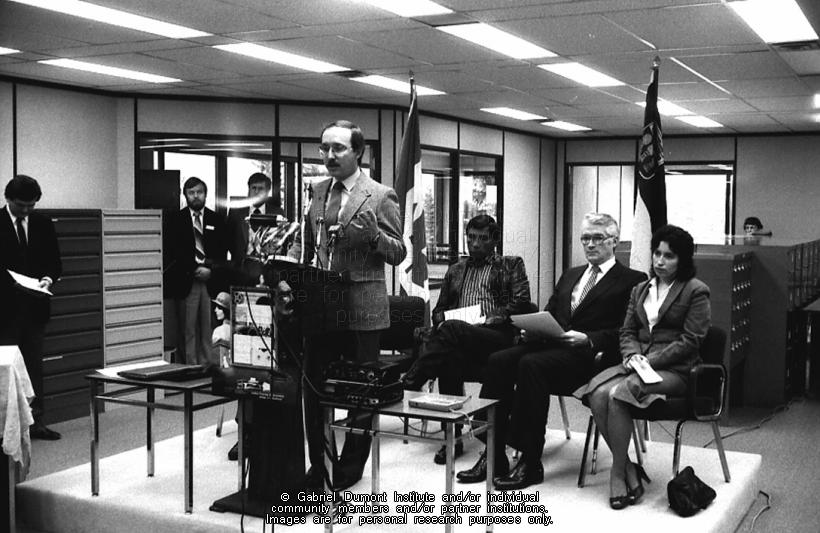 | Description: | Sid Dutchak speaking at the presentation of Louis Riel's diary to the Saskatchewan Archives Board by the Saskatchewan government in Regina, Feb. 23, 1984. From the D.H. Bocking Collection.