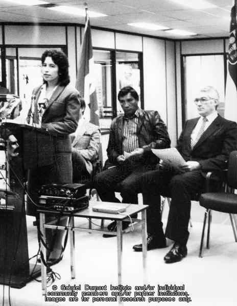 Woman [representing a Métis association?] speaking at the presentation of Louis Riel's diary to the Saskatchewan Archives Board by the Saskatchewan government in Regina, Feb. 23, 1984. From the D.H. Bocking Collection.