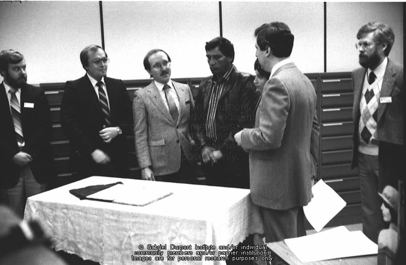 | Description: | Rick Folk, Sid Dutchak, Jim Sinclair, and Ian Wilson, around Louis Riel's diary upon the presentation of the diary to the Saskatchewan Archives Board by the Saskatchewan government in Regina, Feb. 23, 1984. Taken from the D.H. Bocking Collection.