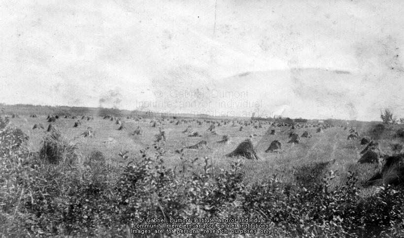 | Description: | Stooks on a farm on the Green Lake Trail, 65 miles from Prince Albert, Mont Nebo SK, 1908. From the Frank J.P. Crean fonds. |