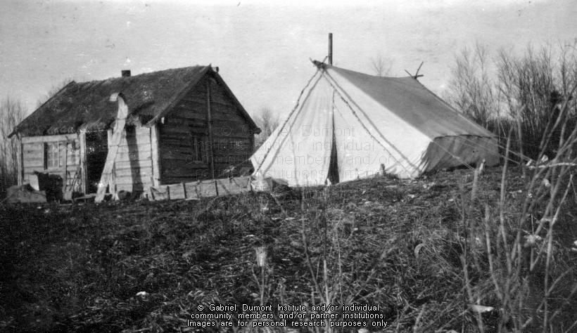 | Description: | A New Northwest Exploration Expedition tent set up beside "Blarney Castle", a log cabin near Ile a la Crosse, SK, September 1908. From the Frank J.P. Crean fonds. |