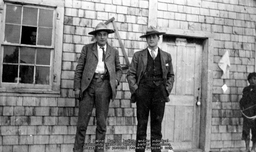 | Description: | Two men and a boy standing outside the Revillon Frères, fur trading post, Ile a la Crosse, SK, September/October 1908. From the Frank J.P. Crean Fonds.