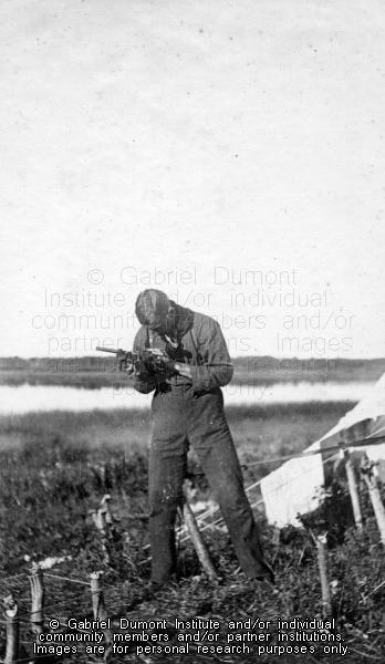 | Description: | A member of the New Northwest Exploration expedition looks closely at his sextant at Waterhen Lake, SK, July 1909. From the Frank J.P. Crean fonds.