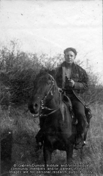 | Description: | T. George Street, member of the New Northwest Exploration expedition riding a horse near Meadow Lake, SK, August 1909. From the Frank J.P. Crean fonds.