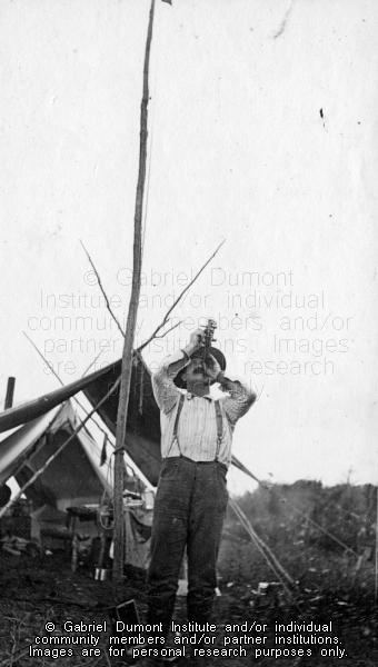| Description: | Frank J.P. Crean, leader of the New Northwest Exploration expedition, using a sextant at the expedition's camp at Waterhen Lake, SK, July 1909. From the Frank J.P. Crean fonds.