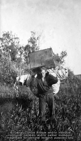 T. George Street of the New Northwest Exploration expedition carrying supplies on his back at a portage between Lac des Iles and the east-west arm of the Beaver River, July 1909. From the Frank J.P. Crean fonds. |