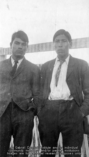 | Description: | Two Métis men at Ile a la Crosse, SK, August 1909. From the Frank J.P. Crean fonds. Same as R-B9751. |