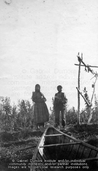 | Description: | An Indian or Métis man and woman standing behind a canoe on the shores of a body of water in northern Saskatchewan, 1908-1909. From the Frank J. P. Crean fonds.