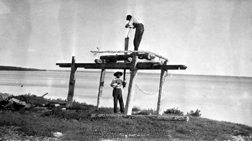 | Description: | Two men, one of who is on a platform above the one below, sawing planks off of a log, northwestern Saskatchewan, 1908-1909. From the Frank J.P. Crean fonds.