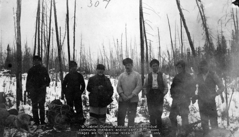Frank J.P. Crean (centre) leader of the New Northwest Exploration expedition with six other men at a winter campsite in northwestern Saskatchewan or northeastern Alberta, November 1909. From the Frank J.P. Crean fonds.