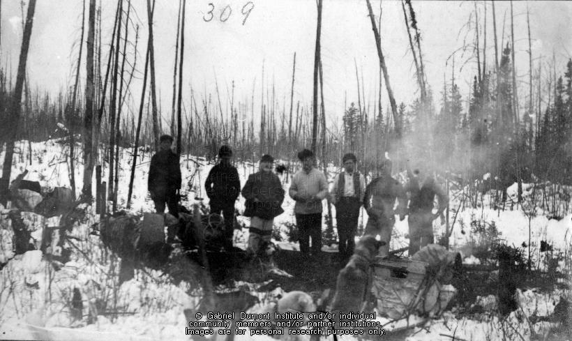 Frank J.P. Crean, leader of the New Northwest Exploration expedition, and six other men at a winter camp, northwestern Saskatchewan or northeastern Alberta, 1909. From the Frank J.P. Crean fonds. |