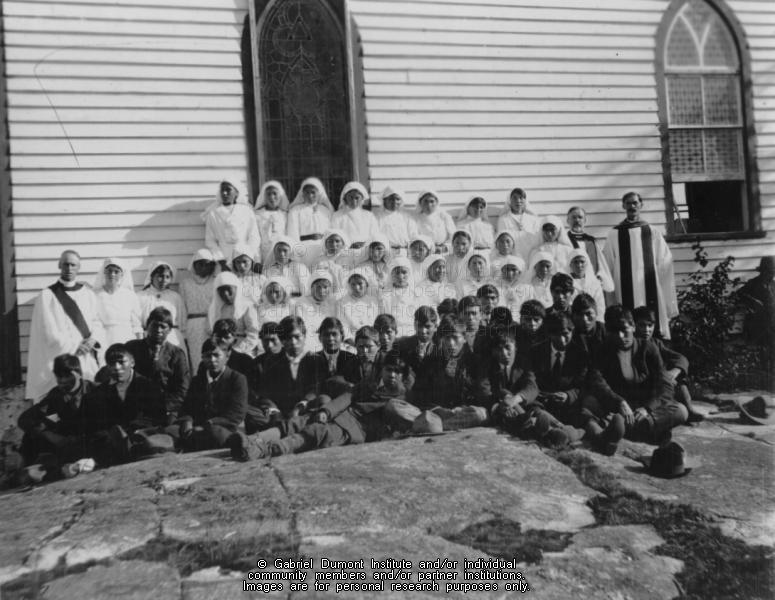 | Description: | Confirmation group outside a church [Cumberland House Anglican Church], between 1905-1919, Cumberland House, SK (Copied 1980 SAB). From the Jervois Arthur Newnham fonds.