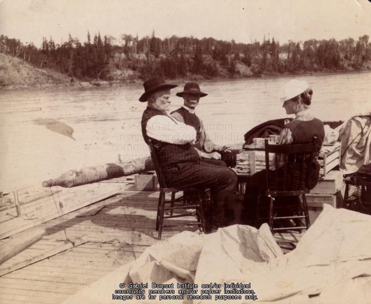 | Description: | Reverend John Matheson, Reverend Exton Lloyd and Mrs. Newnham, on a scow