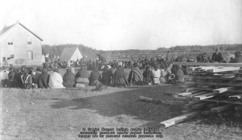 | Description: | Bishop Newnham distributing a treat to native people sitting in a circle, [Sandy Lake], ca.1910. From the Jervois Arthur Newnham fonds.