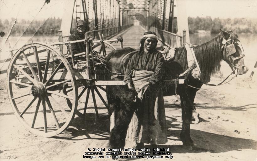 The terminology used in this photograph’s description is racist. The Gabriel Dumont Institute does not condone or accept racist terminology in any form. However, the derogatory term “squaw” was the photograph’s original caption and was used in the past when mentioning Aboriginal women . Therefore, the Institute decided not to change this term. The image shows that Aboriginal people on the Prairies used Red River carts into the twentieth century. |