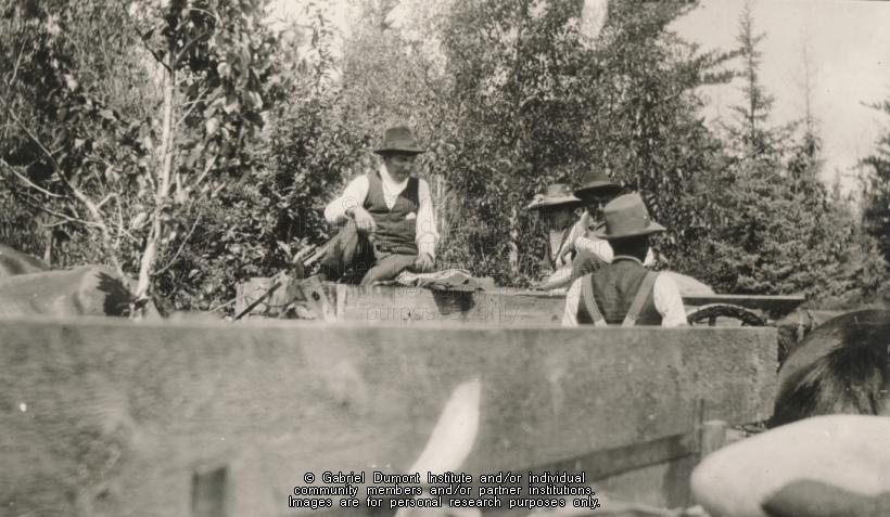 | Description: | Wedding party in their "bridal coach." Willie Bear (with back to camera) was greeting them. Trip of Christina Bateman and Annie McKay to La Ronge, 1919.