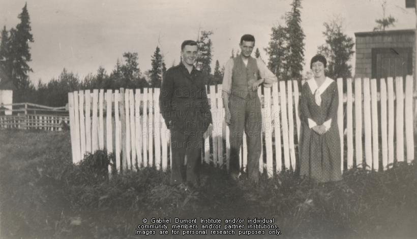 | Description: | Two men and lady by fence. Trip of Christina Bateman and Annie McKay to La Ronge. |